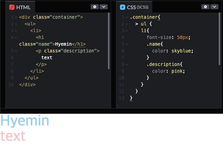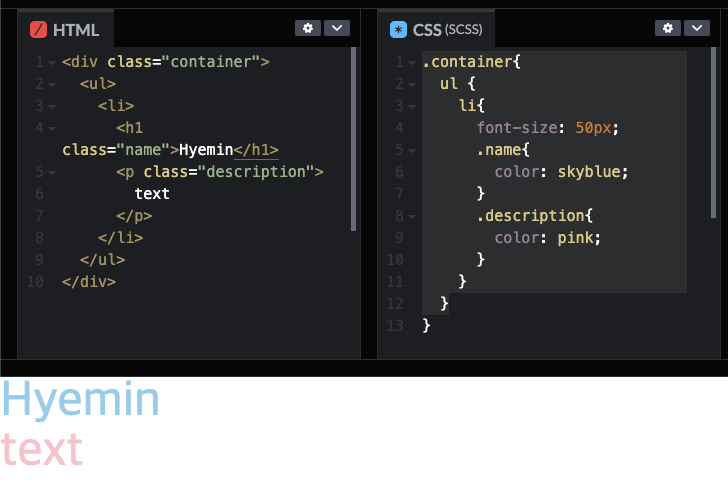 .container ul li { font-size: 50px; } .container ul li .name { color: skyblue; } .container ul li .description { color: pink; }위와 같이 중복되는 후손 선택자들을 SCSS를 사용한다면 줄일 수 있습니다.