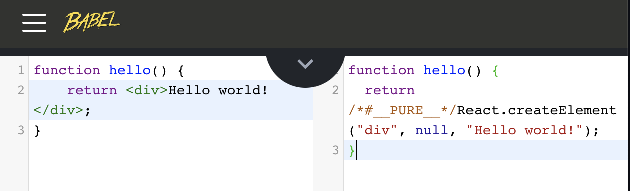 - JSX로 작성된 코드를 바벨을 통해 변환시켜준다.