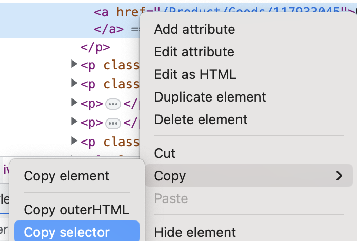 - 구조는 크롬에서 해당하는 내용에 마우스 오른쪽 클릭하고 Copy > Copy selector 를 통해 확인한다.