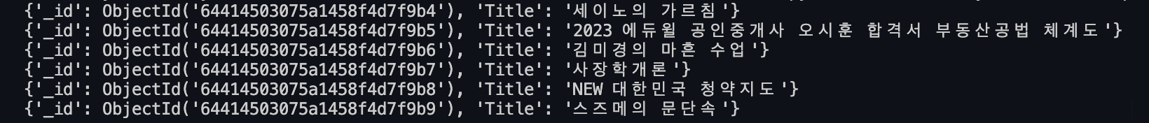 from pymongo.mongo_client import MongoClient client = MongoClient('localhost', 27017) db = client.local collection = db.startup_log rows = collection.find() for row in rows: print(row)그리고 이번엔 새로운 컬렉션을 만들어서 데이터를 조회해 본다.