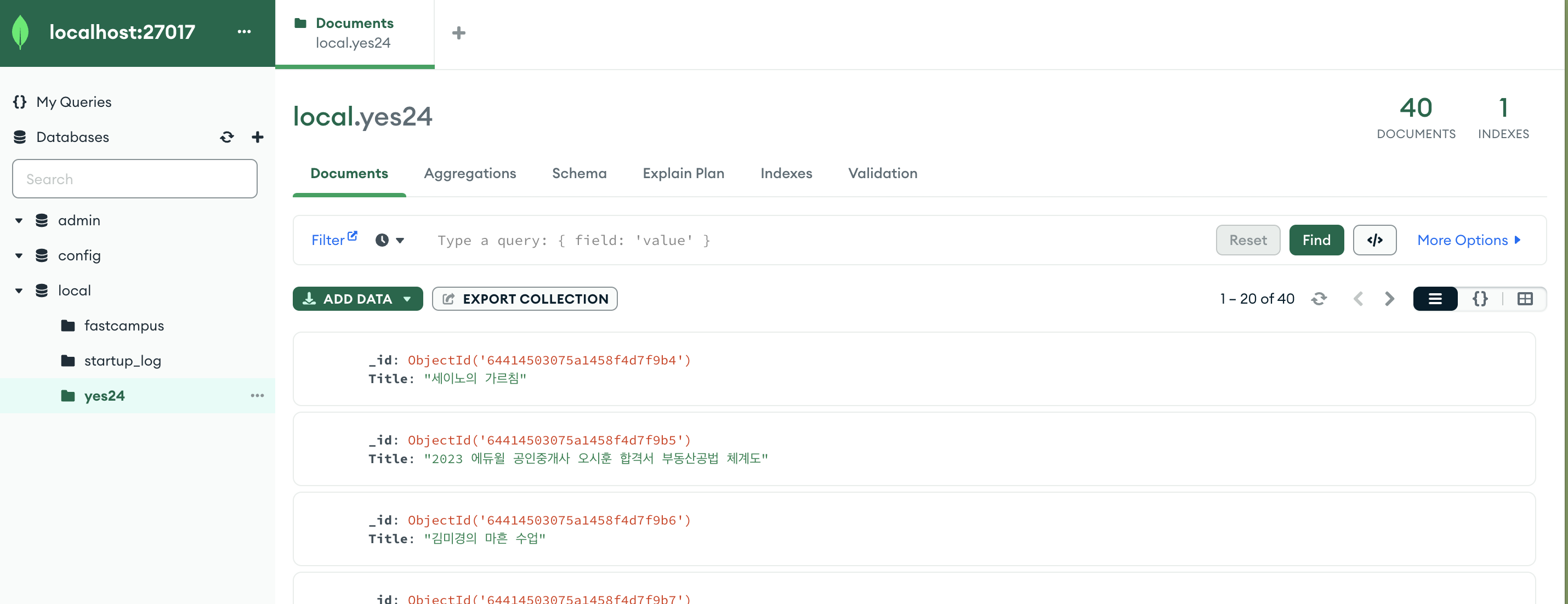 import requests from bs4 import BeautifulSoup from pymongo.mongo_client import MongoClient client = MongoClient('mongodb://localhost:27017/') # DB 접속 db = client.local # DB 선택 res = requests.get('http://www.yes24.com/24/Category/BestSeller') soup = BeautifulSoup(res.text, "html.parser") for i in range(40): index = str(i+1) if index == "19": index = "19_line" elif index == "20": index = "20_line" title = soup.select_one("#bestList > ol > li.num"+ index +" > p:nth-child(3) > a") # 새 컬렉션을 생성할 때는 컬렉션이 이미 있는 것처럼 키로 접근하여 사용하면 자동으로 생성된다. db['yes24'].insert_one({ 'Title': title.text })위 코드를 실행하고, 데이터가 잘 들어갔는지 MongoDB Compass로 확인한다.
