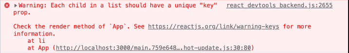 const moves = history.map((step, index) => { const desc = index ? 'Go to move #' + index : 'Go to game start'; return ( <li> <button>{desc}</button> </li> ); });아래와 같은 에러가 발생하는데, key(고유값)을 지정해 주면 해결된다.