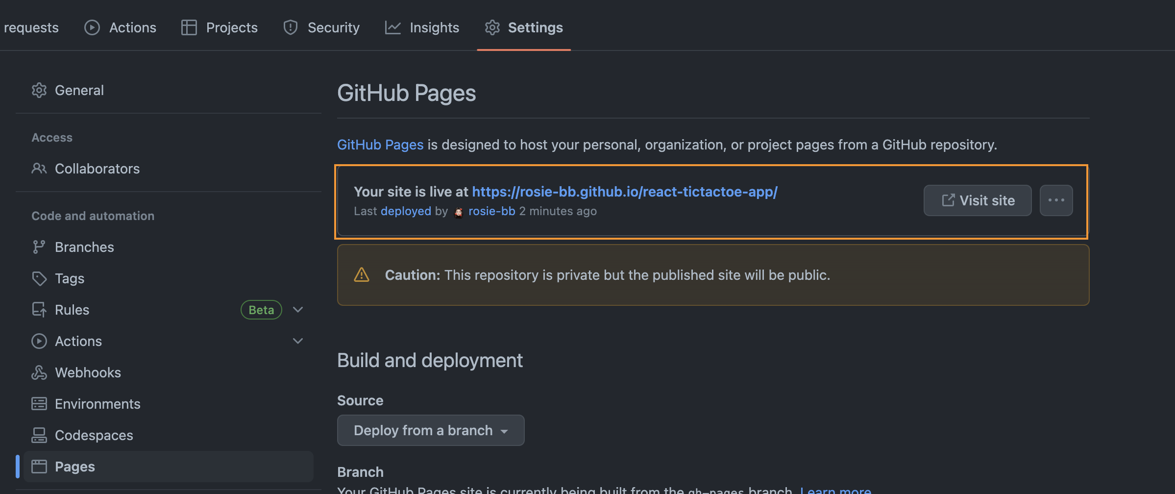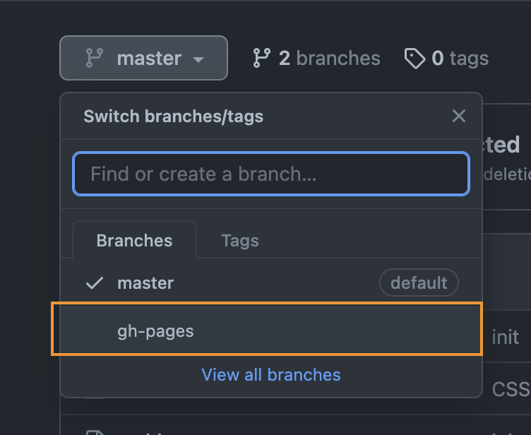 npm run deploy배포가 완료되면(Published) gitub 저장소에서 gh-pages 브랜치 생성되고, Settings > Pages에 배포된 경로가 나온다.