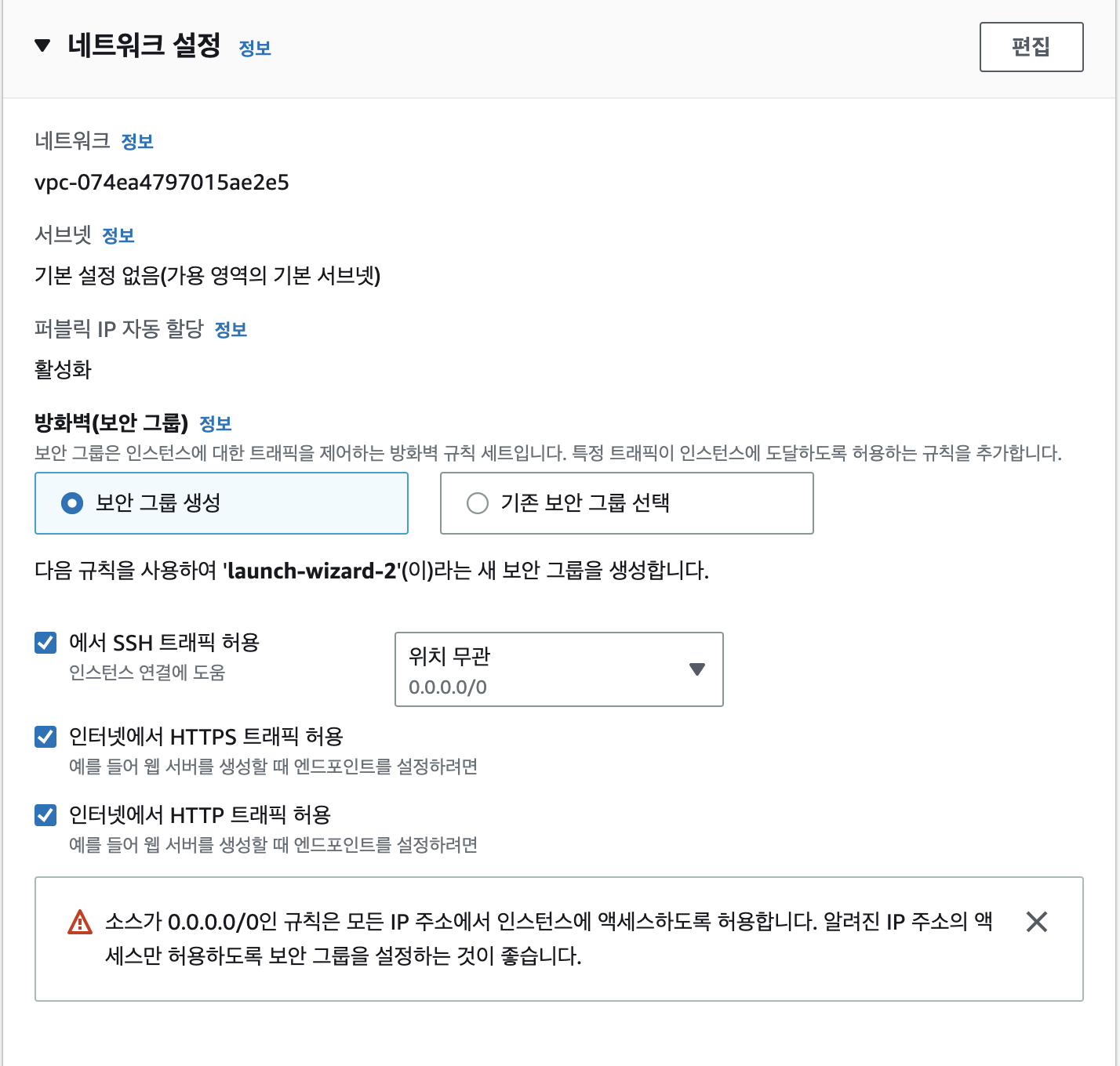 - 웹사이트 제공용이니 SSH, HTTP, HTTPS 트래픽 허용 모두 체크한다.